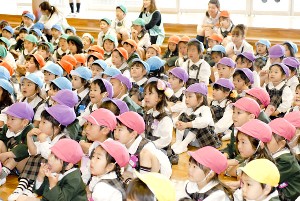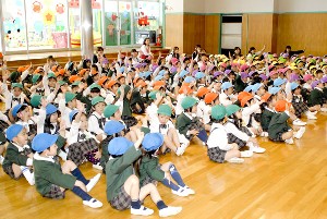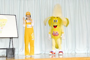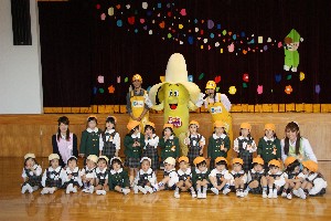 バナナのボビー君が幼稚園に来てくれました。「好き嫌いなく何でも食べよう!」「よく噛んで体の中で元気玉をつくろう!」というお話やクイズ、お歌も歌って、ボビーくんと楽しく過ごしました。