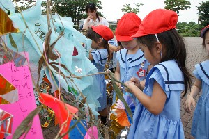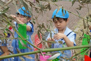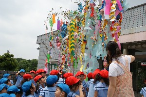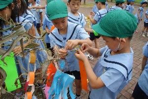 舎人公園へ年長組がみどり幼稚園の代表として“七夕飾り”に行きました。みんなの願い事を書いた短冊もしっかり結んで、とても素敵な笹が完成しました。子ども達が明るく元気に健やかに育ちますように☆★☆7月7日まで舎人公園管理事務所前に飾ってありますのでご覧ください☆