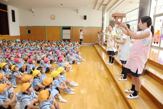 幼稚園のホールでお家の方と一緒に先生や同年齢のお友達とリトミックや体操をして楽しく遊びます。(無料)