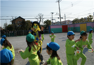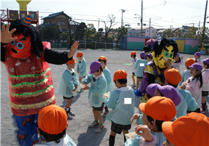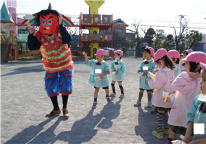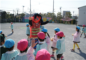 まめまき会を行いました♪すると、遊具の後ろから3匹の鬼さんがやってきました!!いちご組さん(4年保育)はビックりして泣いてしまった子もいましたが、頑張って「鬼は~そと~」と豆を投げていました。今度はお家でも、わる~い鬼さんがこないように豆まきをしてくださいね♪