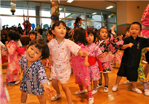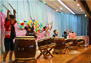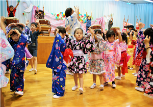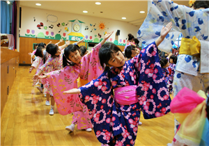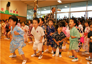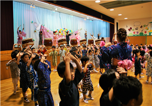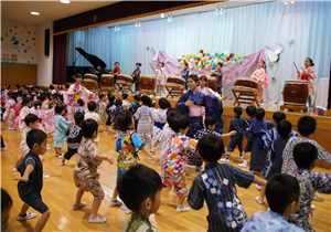 あいにく雨天の為ホールで行いましたが、年長組による和太鼓は盆踊りを大変盛り上げてくれました♪