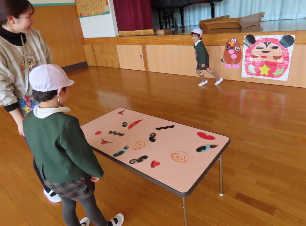 年中組は、福笑いゲーム遊びを行いました。