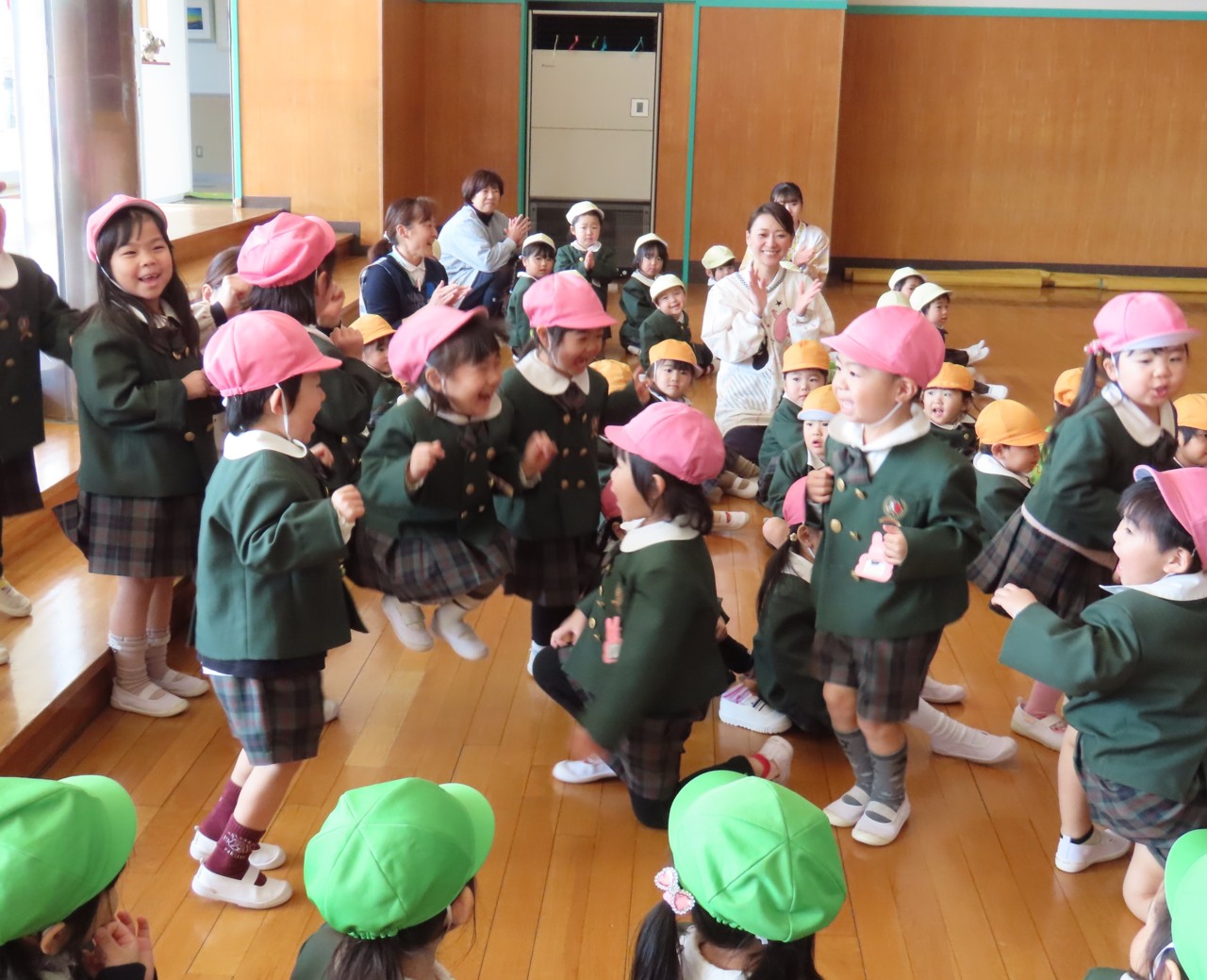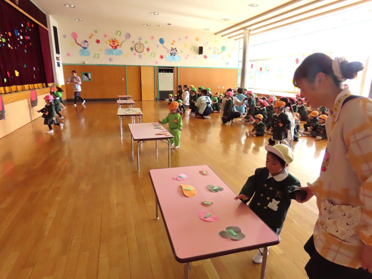 幼稚園のホールでお家の方と一緒に先生や同年齢のお友達とリトミックや体操をして楽しく遊びます。(無料)